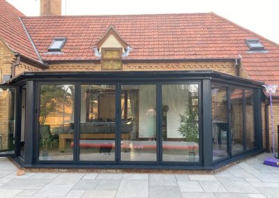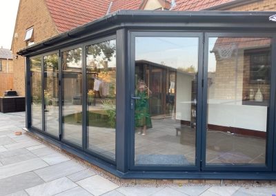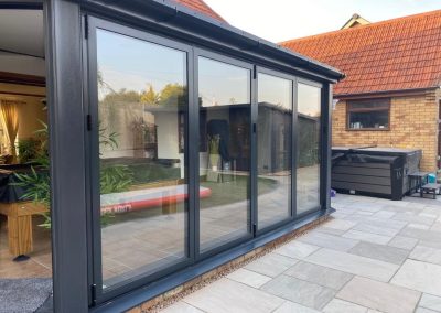 The customer chose three large Anthracite grey Aluminium bifolds to replace her old upvc French door arrangement.